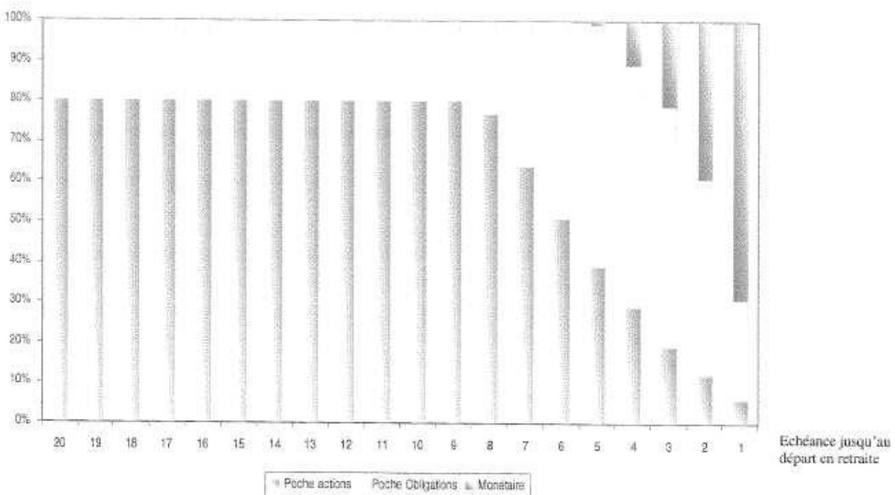 Le tableau ci-dessous exprime l'allocation d'actif retenue en fonction de l'échéance qui reste à courir avant la date de départ à la retraite de l'adhérent. La poche actions est ici composée du FCPE THALES Actions internationales.