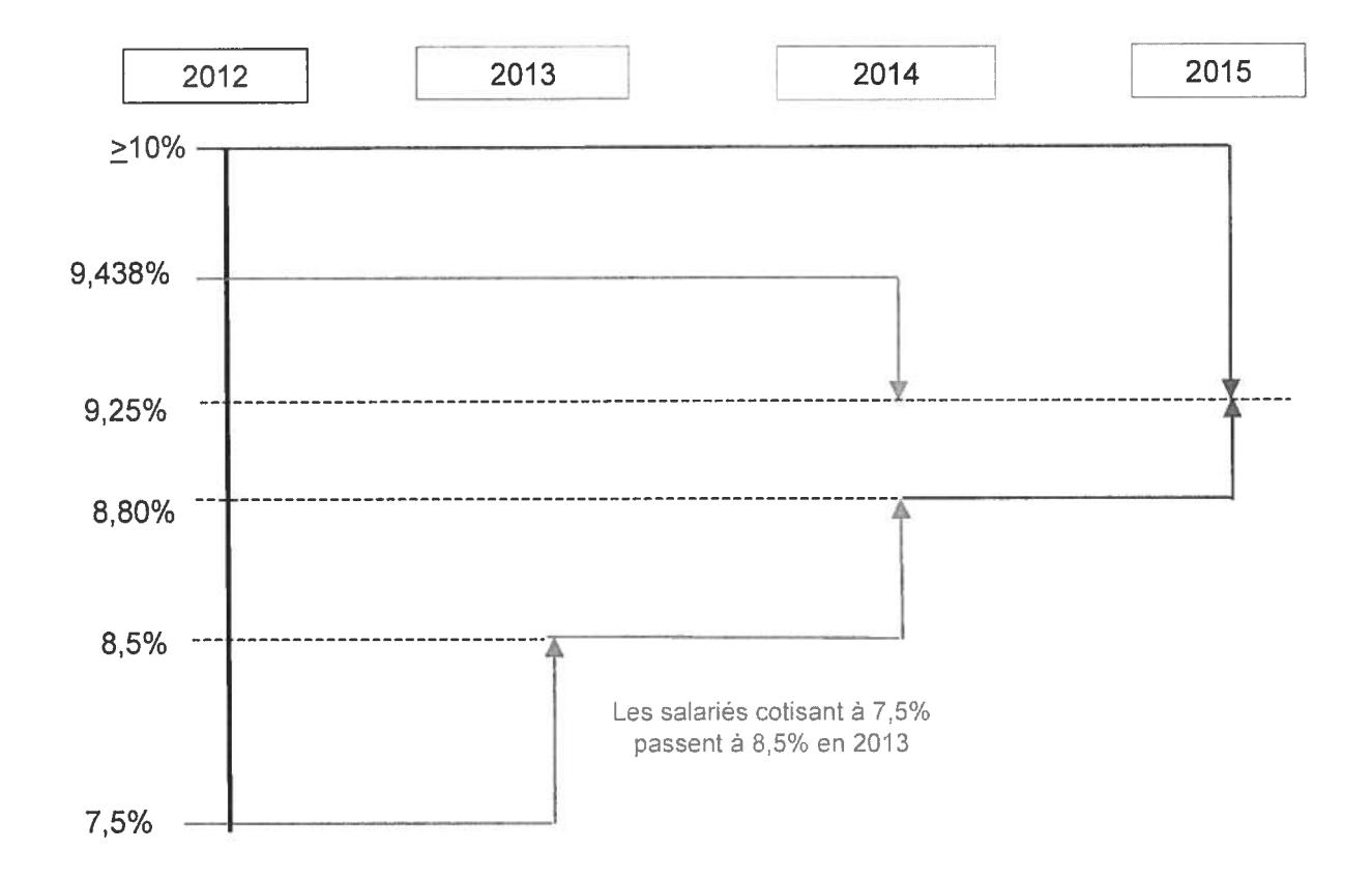 L'application de ce nouveau taux peut avoir pour effet de modifier les cotisations à verser, tant pour les salariés que pour l'employeur. Aussi, afin de faciliter le ralliement au taux cible de 9.25 pour les salariés des sociétés qui aujourd'hui cotisent à un taux différent, un ralliement sur trois exercices (2013, 2014, 2015) sera retenu.