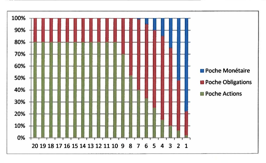 Le tableau ci-dessous exprime l'allocation d'actif retenue en fonction de l'échéance qui reste à courir avant la date de départ à la retraite de l'adhérent.